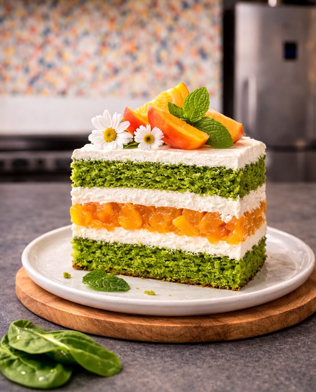 Spinātu biskvīta kūka ar maigu biezpiena krēmu un sulīgu persiku–aprikožu compote kārtu — viegla, koša un patiesi priecīga. Tā ir kūka, kur satiekas pavasara svaigums, saulaini augļu toņi un mūsu garšai tik mīļais biezpiens.