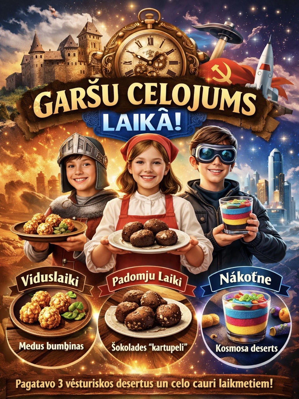 Vēsture caur garšām – jaunieši izprot, kā ēdien atspoguļo laikmetu un resursus. Praktiska gatavošana komandā ar vadītāju, daudz vērtīgas informācijas par sastāvdaļām, kā tās miksēt, lai būtu rezultāts.